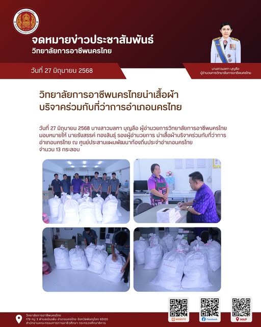 วันที่ 27 มิถุนายน 2568 นางสาวมลฑา บุญลือ ผู้อำนวยการวิทยาลัยการอาชีพนครไทย มอบหมายให้ นายรังสรรค์ ทองสินธุ์ รองผู้อำนวยการ นำเสื้อผ้าบริจาคร่วมกับที่ว่าการอำเภอนครไทย ณ ศูนย์ประสานแผนพัฒนาท้องถิ่นประจำอำเภอนครไทย จำนวน 13 กระสอบ